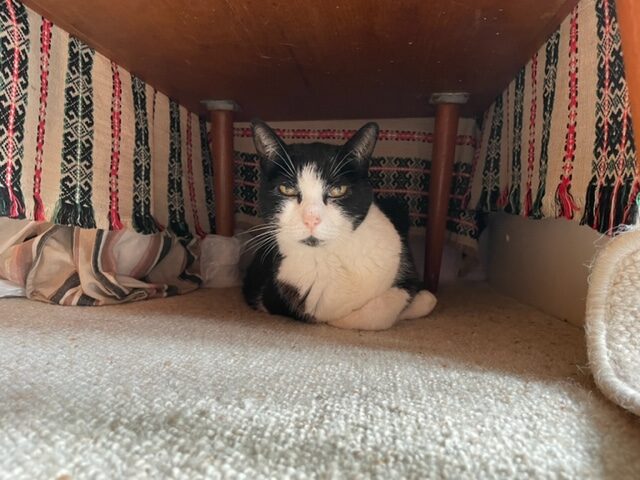 Blackie had a few favorite places during the course of her time with us where she enjoyed resting. They included the sofa, the floor by the living room full-length window/glass door, the sunny floor area in my room in the winter, a box by the window on the kitchen counter, under my desk or a small table next to it, on a couple of chairs, and the kitchen rug in front of the sink. Outside, she enjoyed the balcony and the staircase. In the backyard, it was the palm garden where we first met her, and an old lounge chair that I got for my sixtieth birthday, but which was now worse for wear. All these places, and others, no doubt still have her energy, and we feel that she is still with us, albeit in a different form.