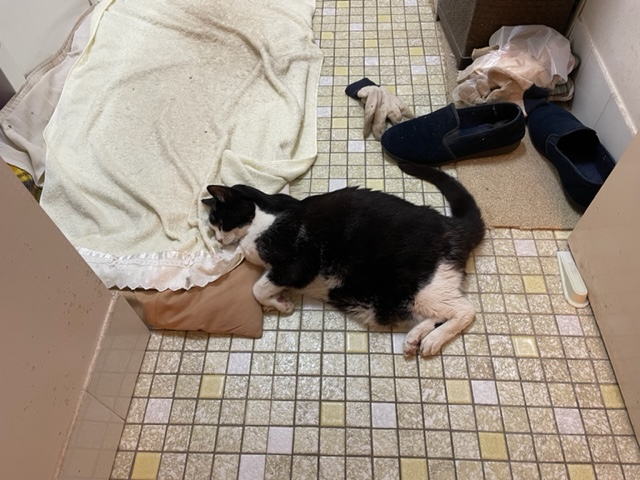 During her last week out in the backyard, we would let her rest in the bushes during the day, but brought her to her favorite lounge chair which was cleaner and sheltered, for the night. She was slowly losing strength and could no longer make her daily trek across the yard to the palms. Finally, when the weather got cooler, we brought her back into the house. We made a comfortable soft bed for her on the laundry floor, where she just mostly lay, though she did move around a bit and with what seems the last bit of energy disturbed some surrounding shoes and garden gloves.